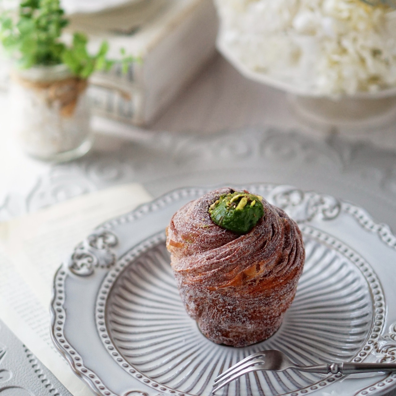 紋章のように高貴な雰囲気のアラベスクのレリーフにドットを合わせ、リブを付けることで釉薬の濃淡による陰影が作り出される美しいデザインになっています。