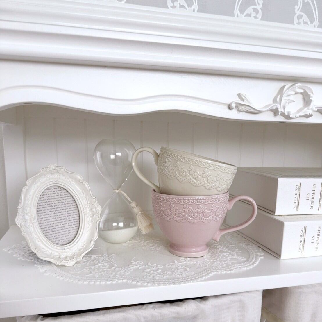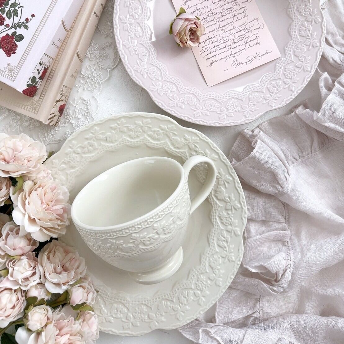 レースのような繊細な模様がマグカップの美しさを際立てます。