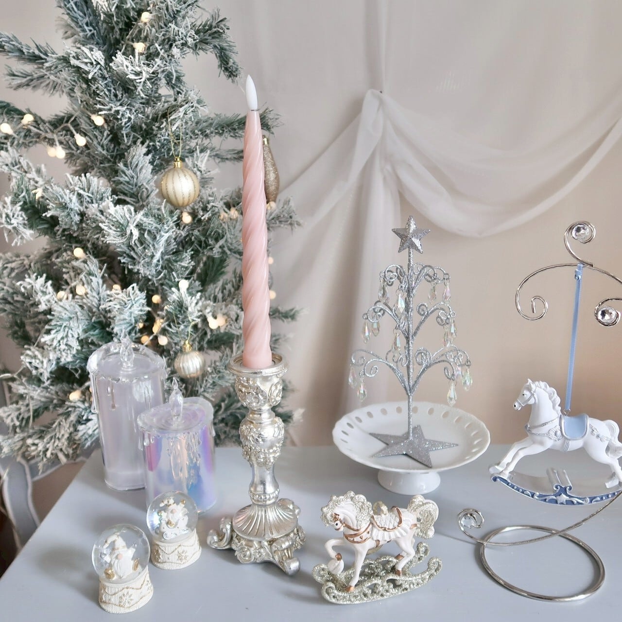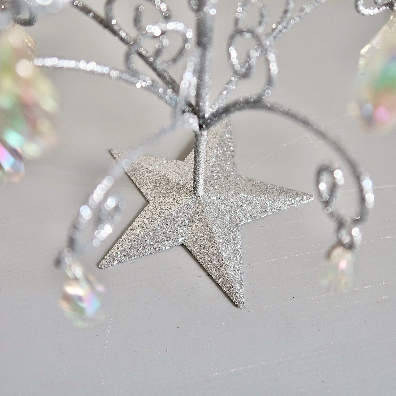 ビーズドロップが揺れるおしゃれなシルバーのメタル製クリスマスツリーオブジェ。