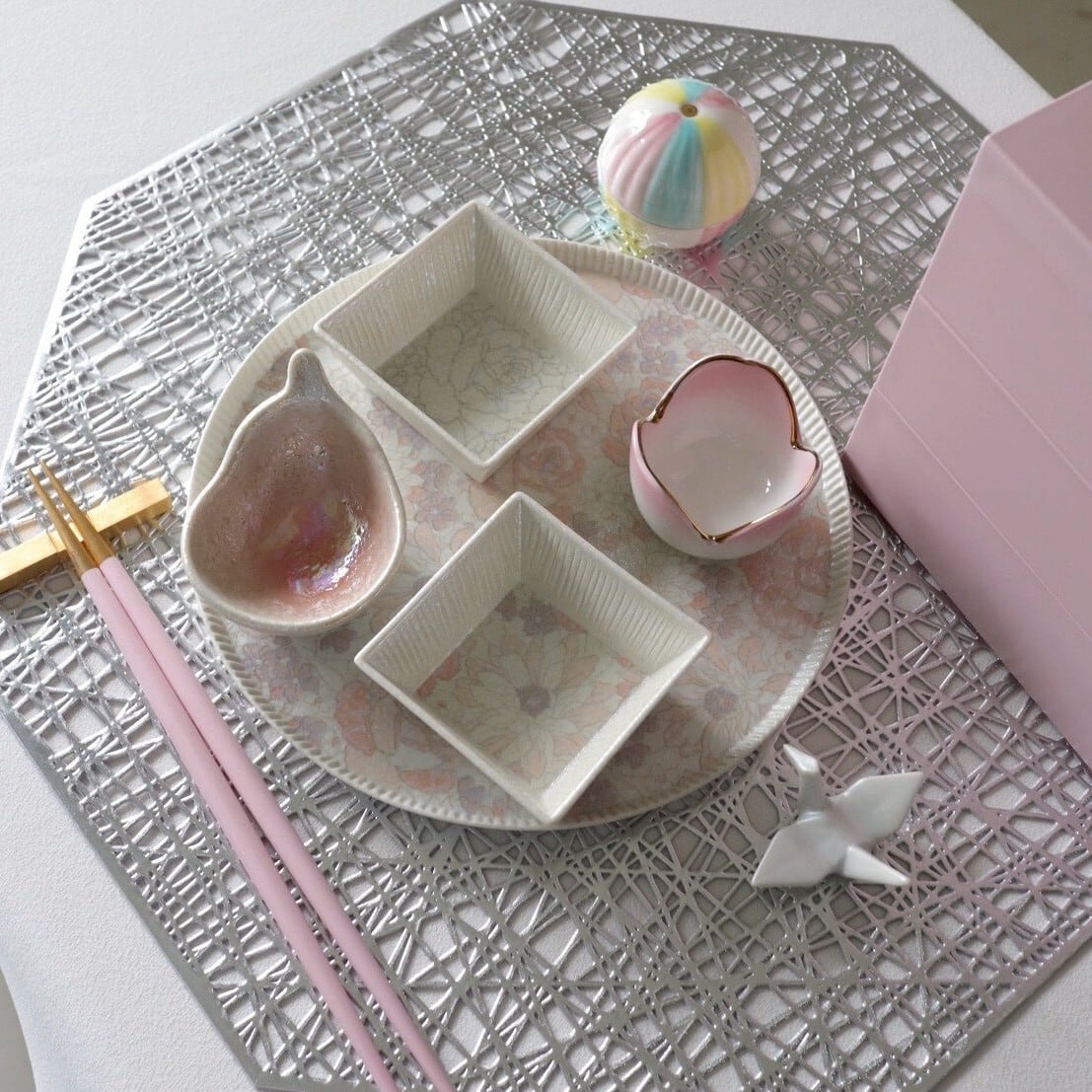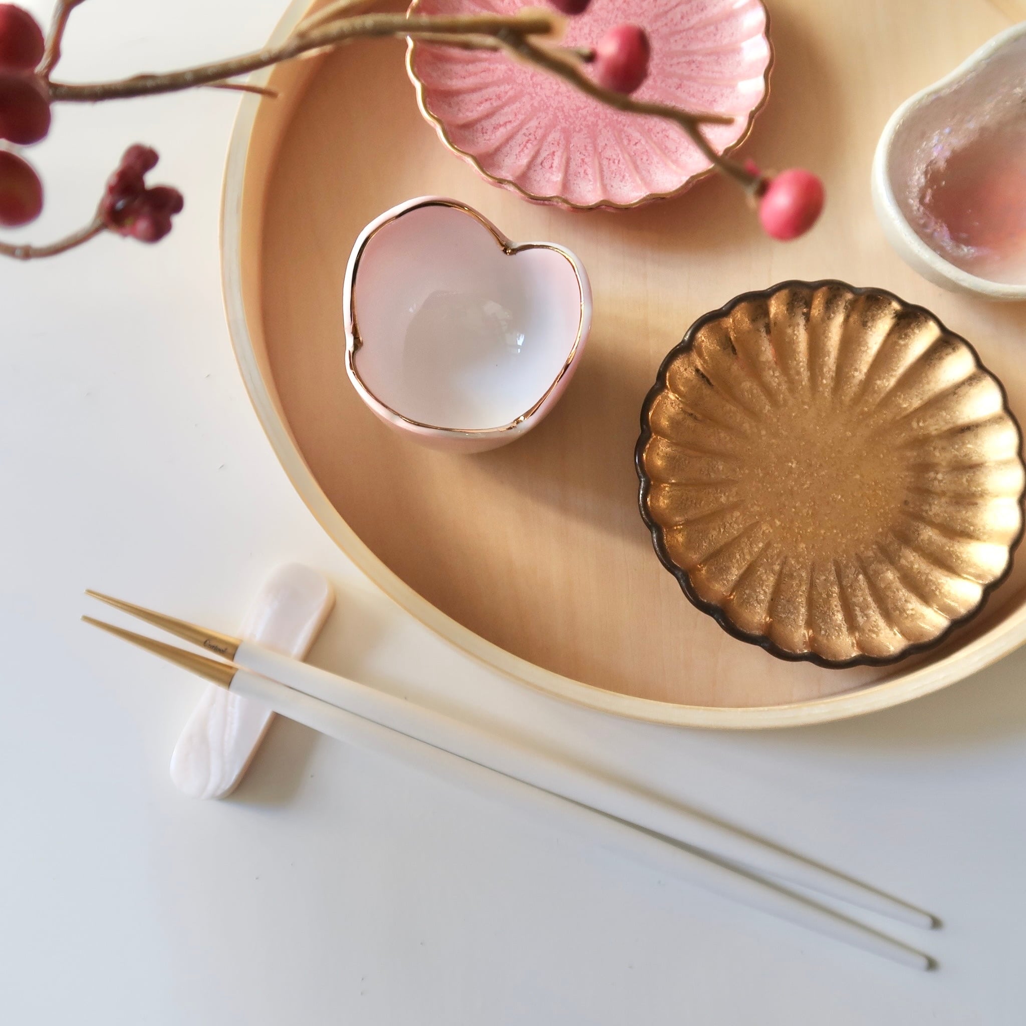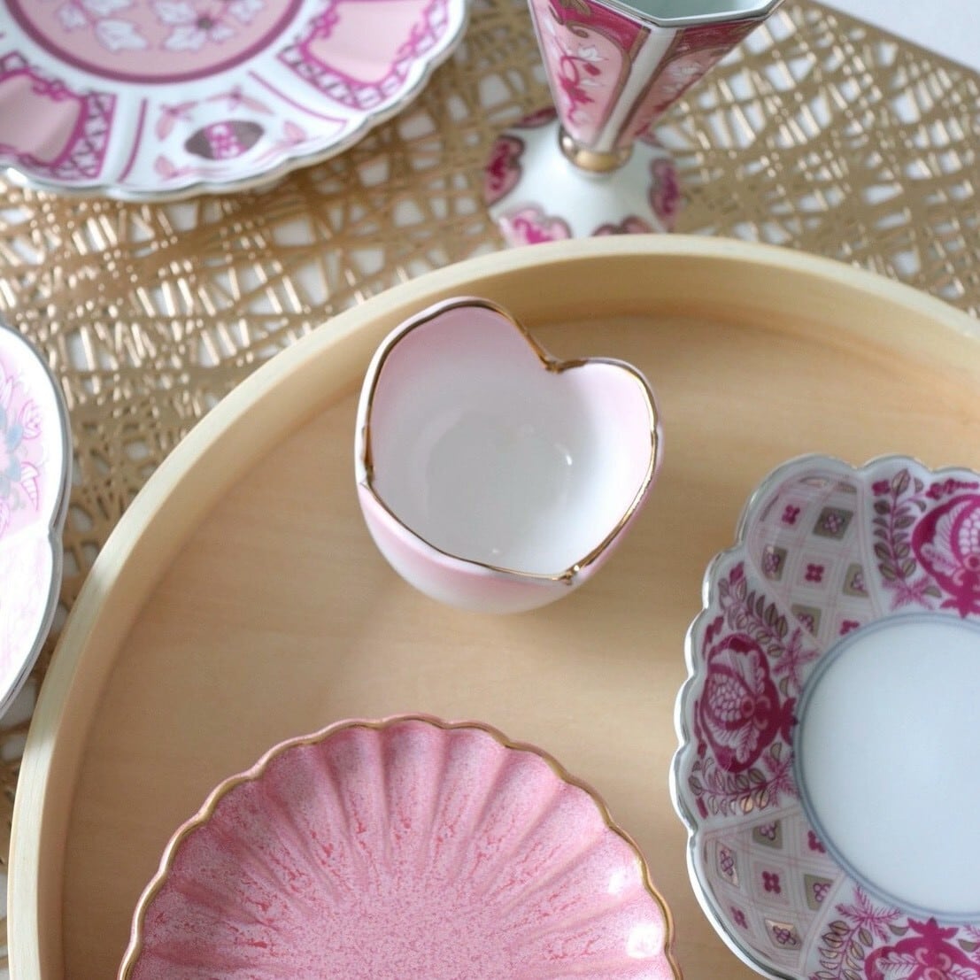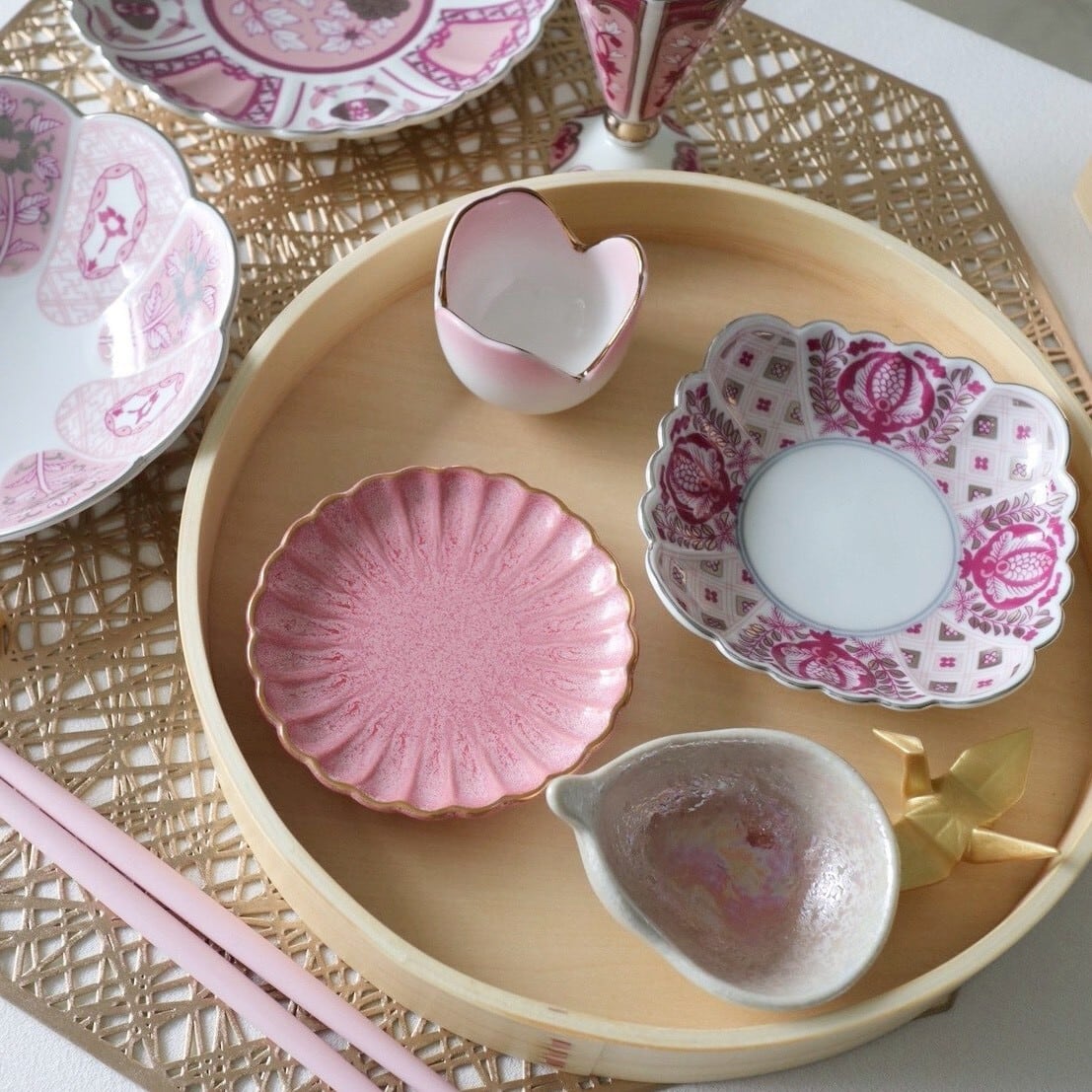 淡いピンクのグラデーションと金縁がテーブルを華やかに彩ります