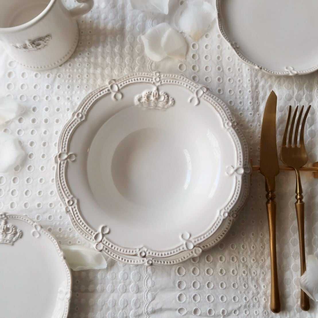 王冠のレリーフにドットの縁取りがおしゃれな陶器のボウル。