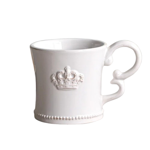 王冠のレリーフに曲線の取っ手がかわいいマグカップ。