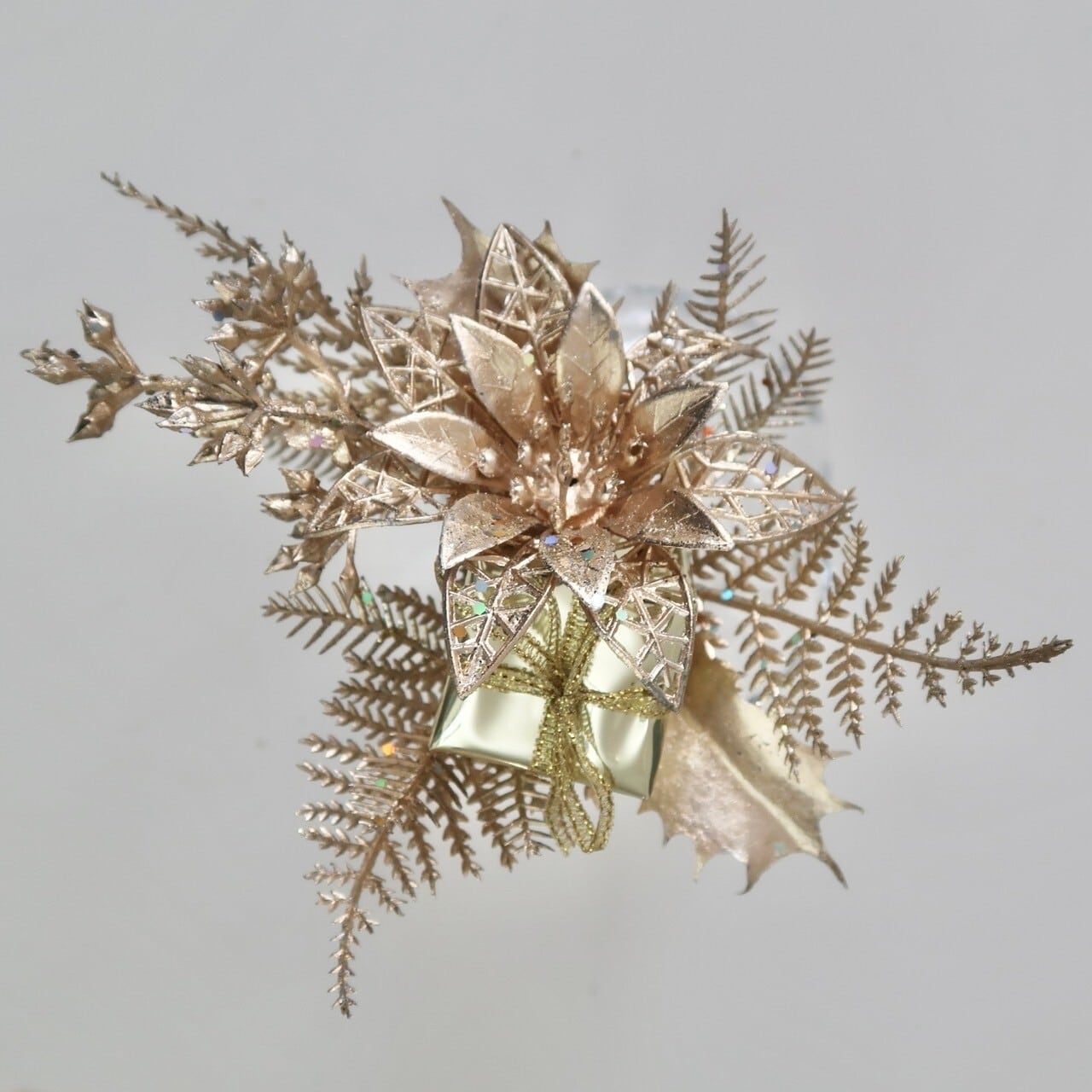 シャンパンゴールドのカラーとギフトボックスなどの飾りが可愛いピック。